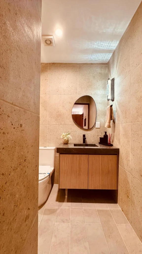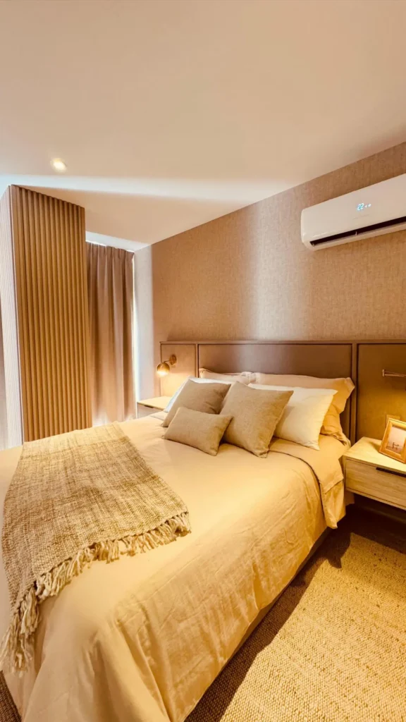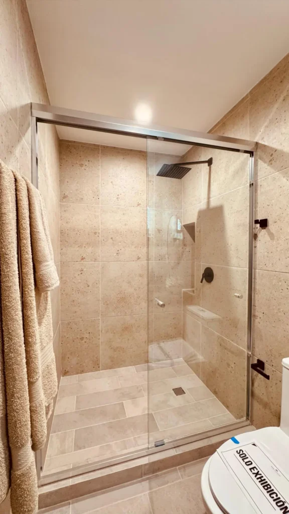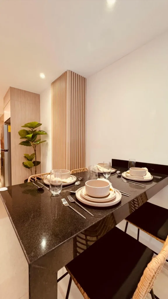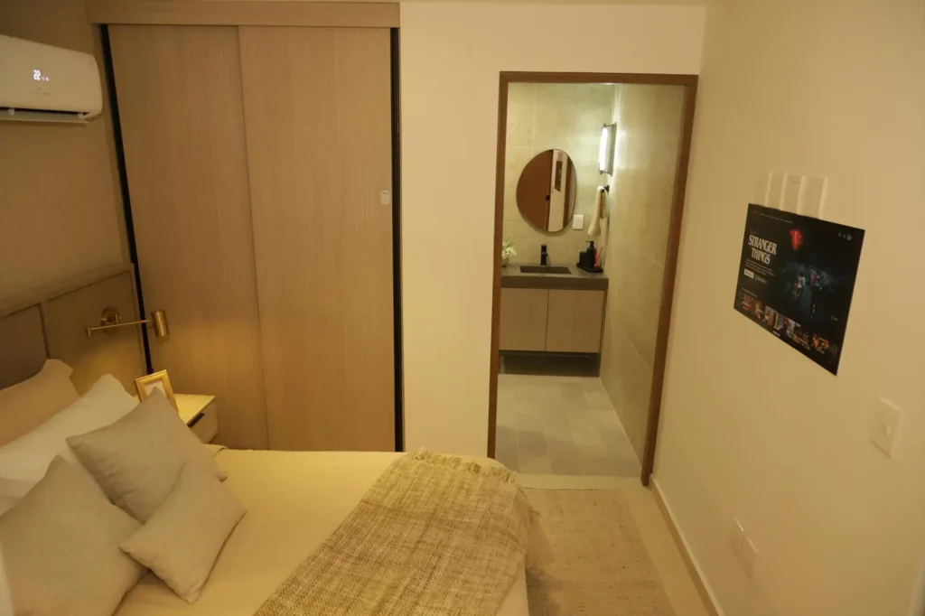 El departamento-muestra cuenta con dos recámaras, dos baños completos (uno de ellos en la recámara principal), sala-comedor, cocina y una terraza con vista al mar.