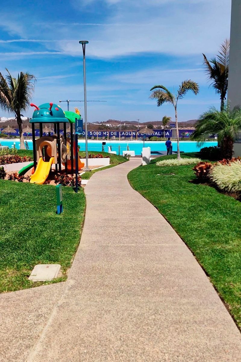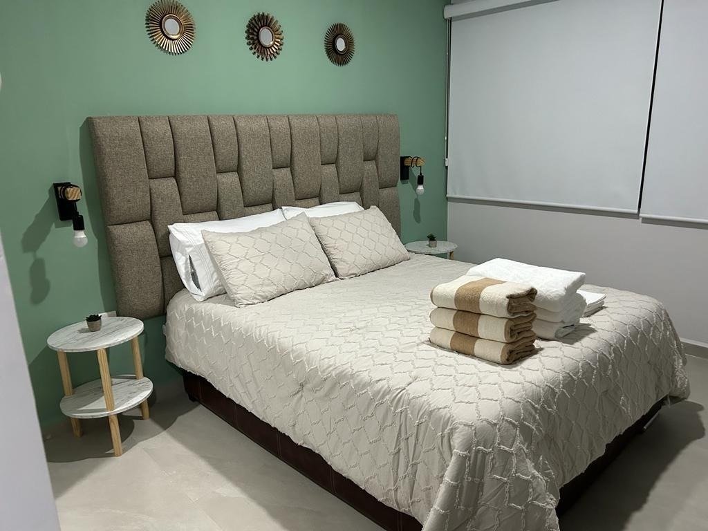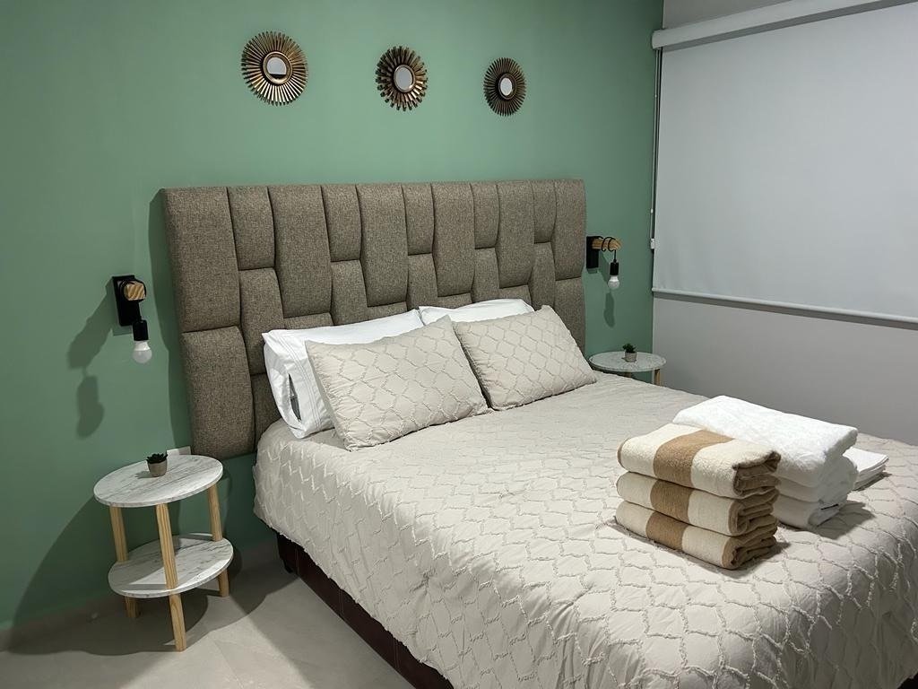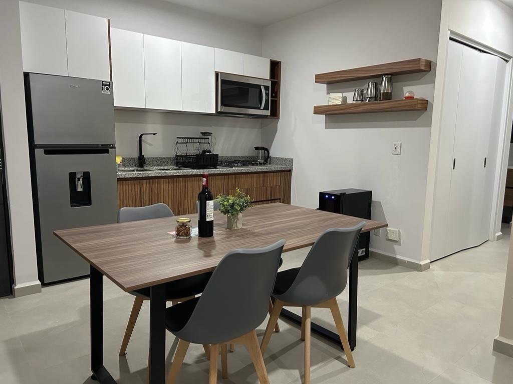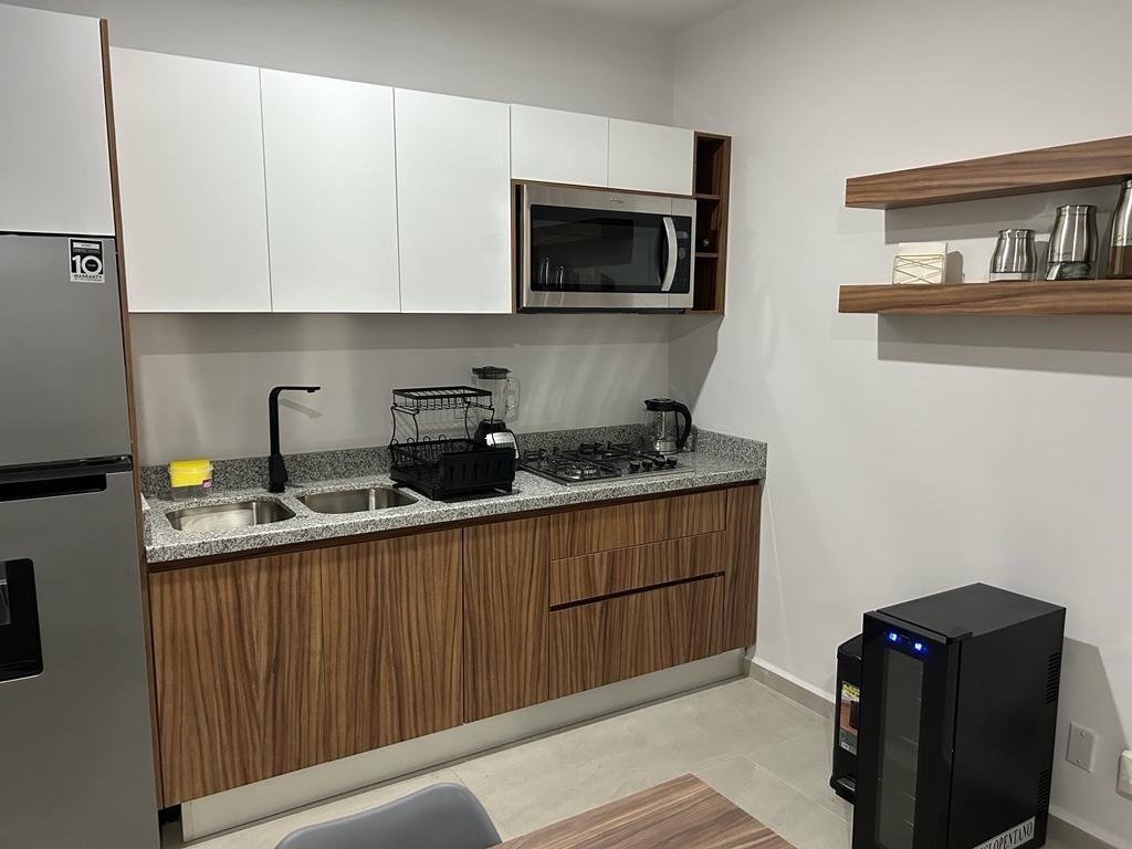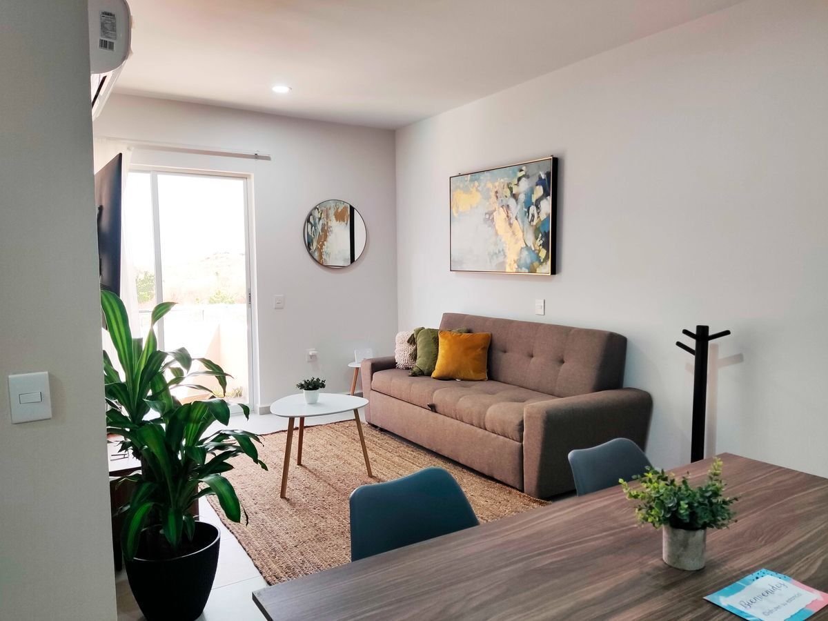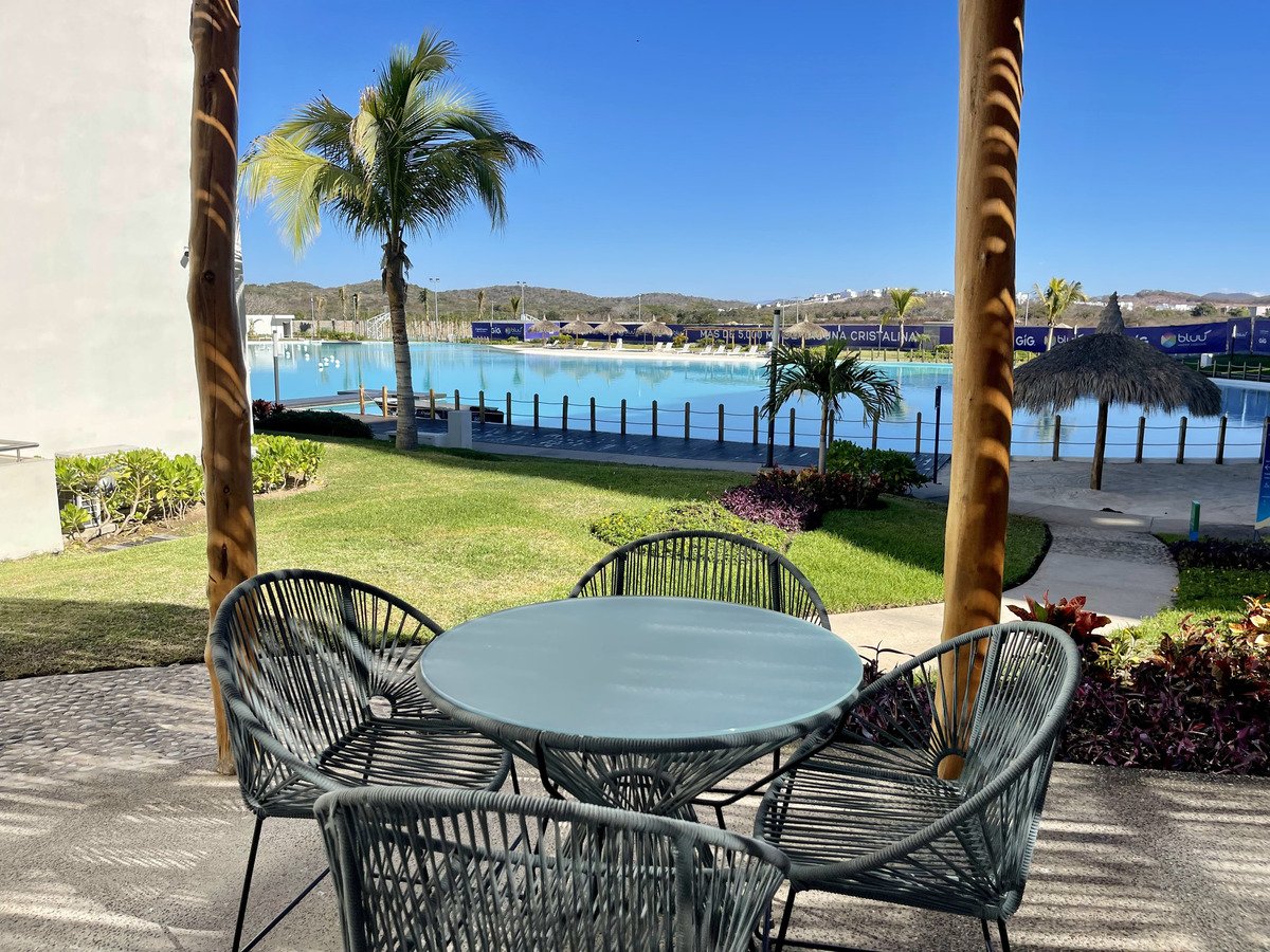 Elegante departamento con 2 sofás camas, recámara principal con cama Queen Size y cocina equipada (microondas, campana, parrilla, refrigerador, licuadora y tostadora). Sala con vista a la laguna artificial de 5,000 m².