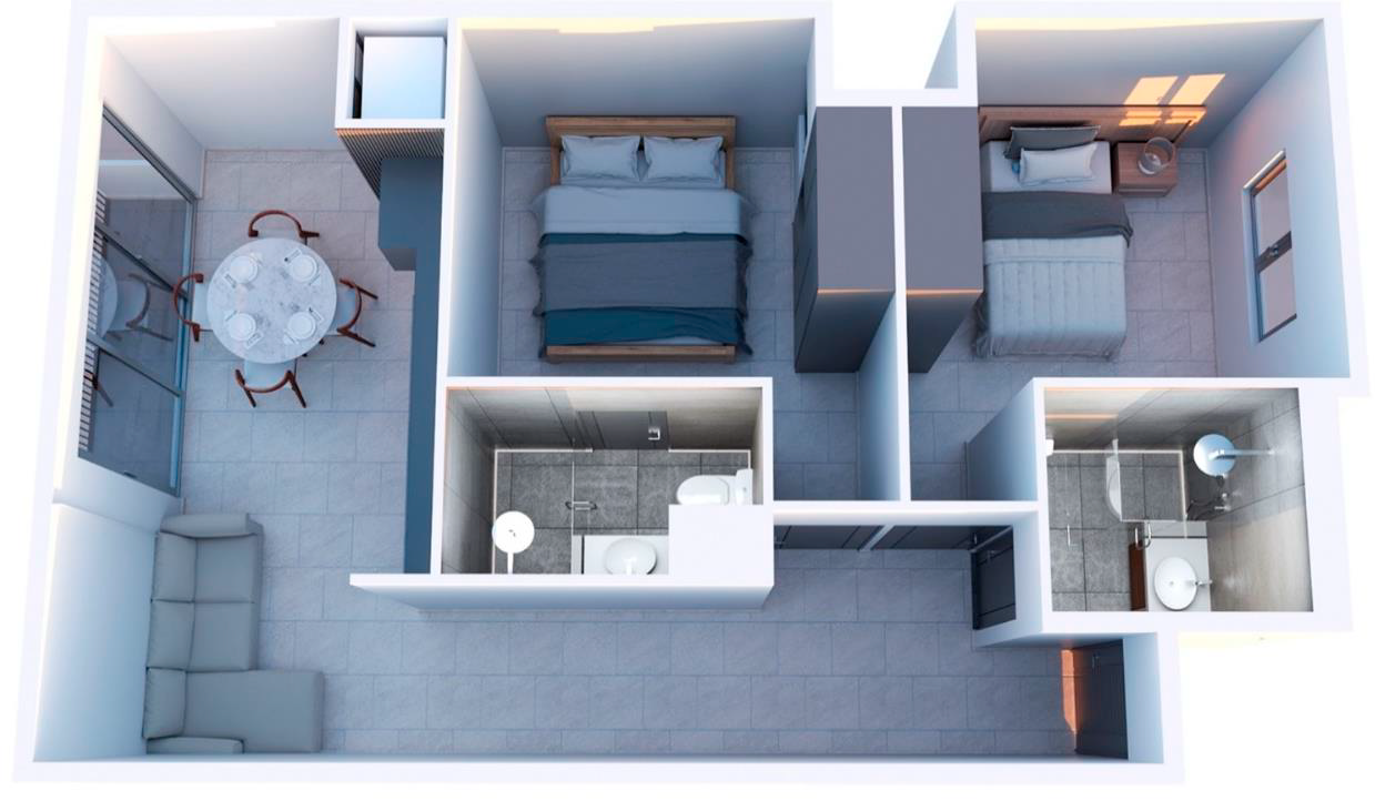 El Modelo Alba (D2) ofrece 60.76 m² con 2 recámaras, 2 baños completos, sala-comedor, cocina integral y balcón privado.