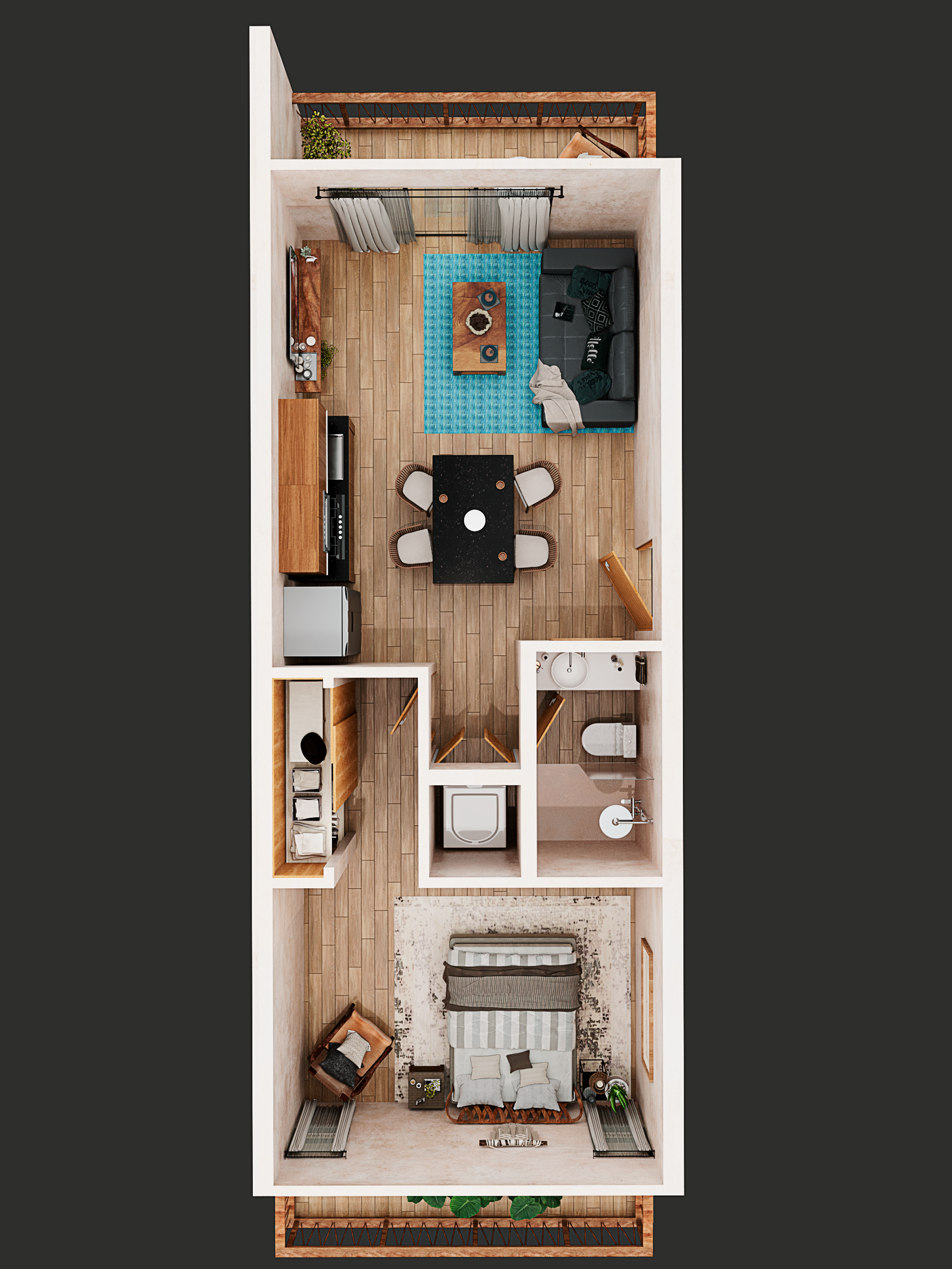 Cuenta con 1 recámara, 1 baño, sala, comedor, cocina equipada y espacio para lavadora y secadora de torre.
